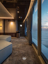 A floor-to-ceiling window saloon designed for ultimate relaxation with stunning ocean views. The room features a unique sofa perfect for easy mingling.